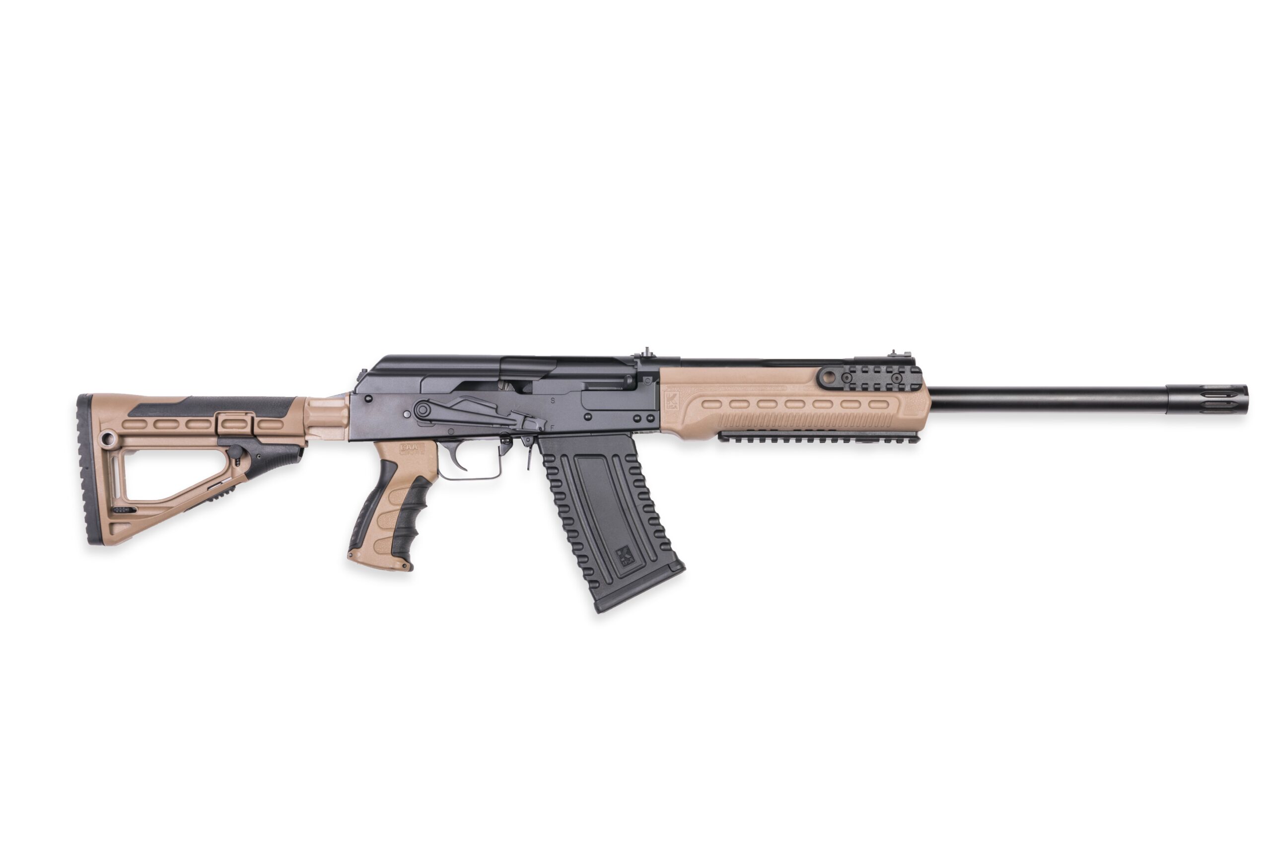The Kalashnikov USA™ KS-12T Flat Dark Earth (FDE) shotgun is our 12-gauge semi-automatic shotgun based on the popular Russian Saiga shotguns. However, our version is built in the United States by American workers using US made parts and materials. In addition to the different furniture color, the KS-12T FDE model differs from our standard KS-12 by incorporating the popular M4-style adjustable buttstock (and six-position receiver extension) in place of the KS-12’s fixed buttstock. This allows users to adjust the length of pull to better fit their body type or install aftermarket stocks with different cheek welds or features. This is particularly useful for shooters wishing to install optical sights. The KS-12T FDE shotgun also incorporates an adjustable pistol grip, a threaded barrel with detachable flash suppressor, a tri-rail forend to fit illumination or laser aiming devices, and an AK style side-mounted optics rail.