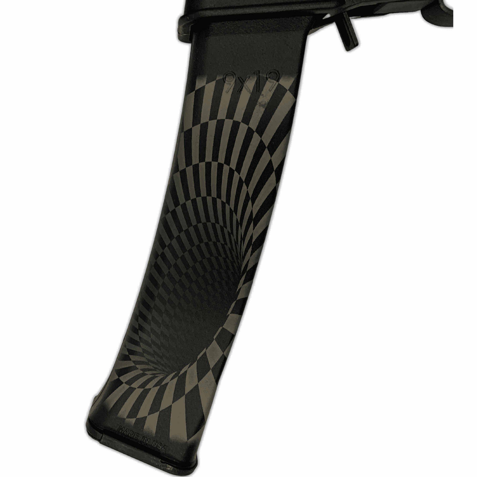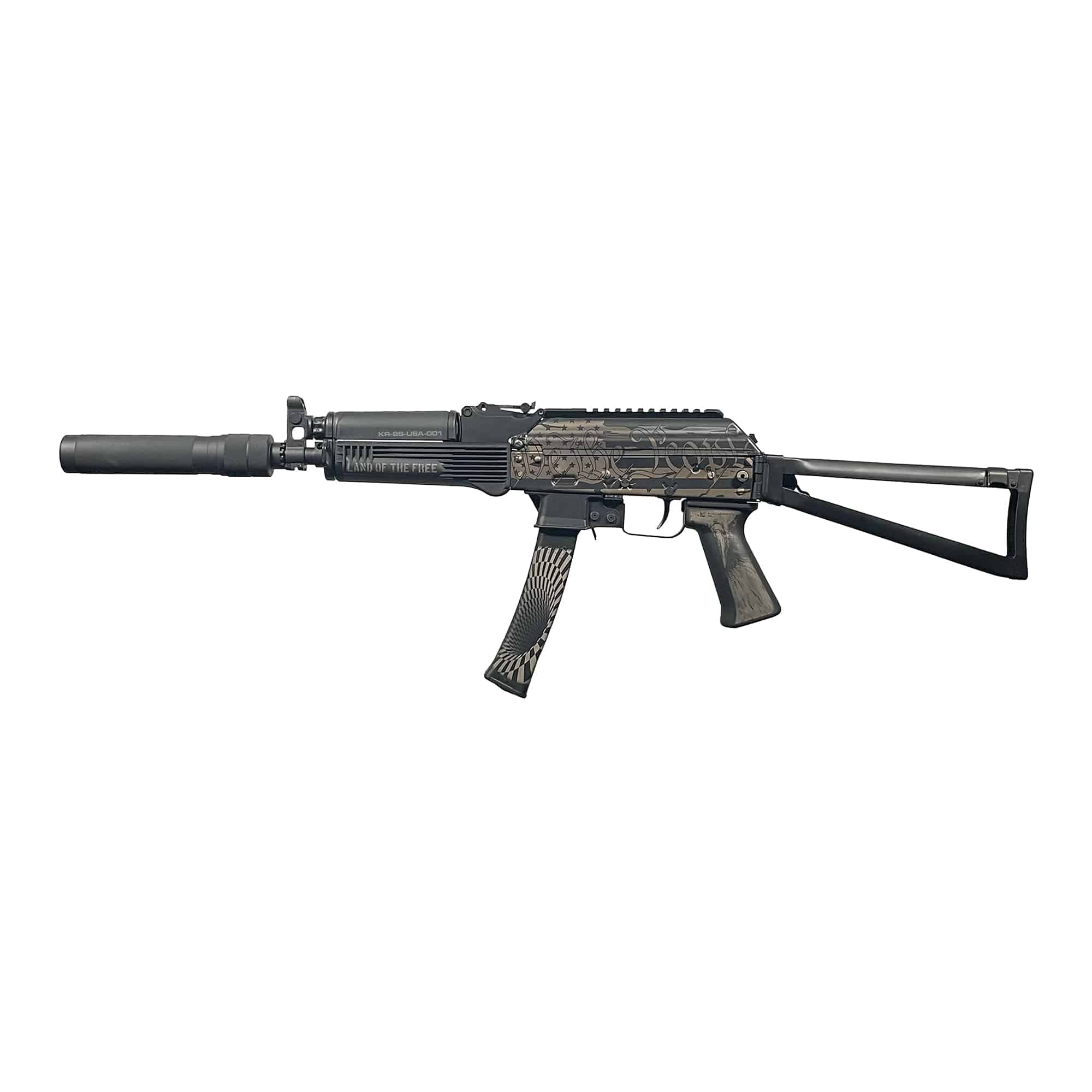 The KR-9S is a semi-automatic AK-style rifle based on the Russian Vityaz submachine gun. It works with a closed bolt blowback operation and comes with a 16.33 inch barrel. It is chambered in 9x19mm and comes with a faux suppressor on the barrel, hence the name KR-9S. It is the closest firearm to a Russian Vityaz but 100% made in the US.