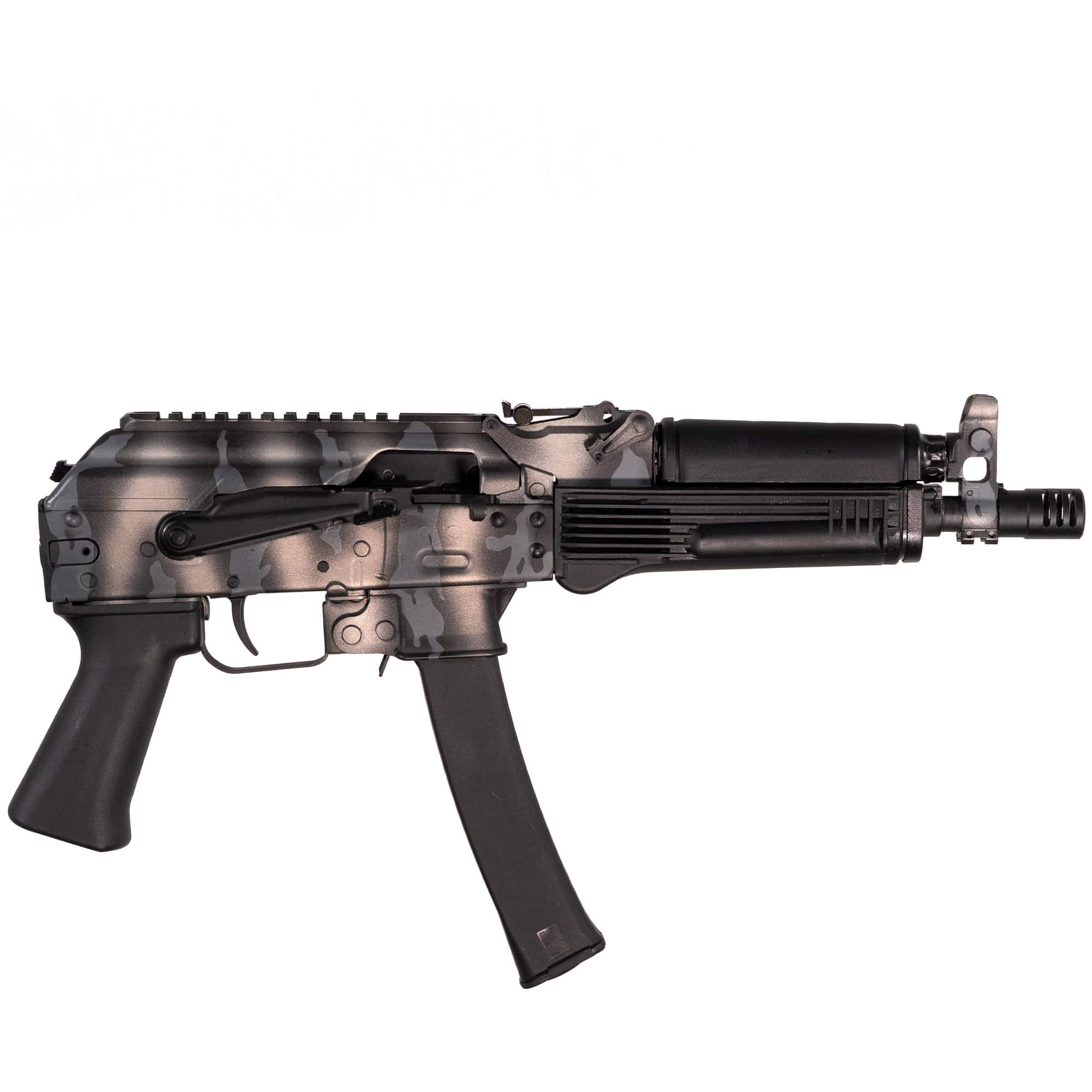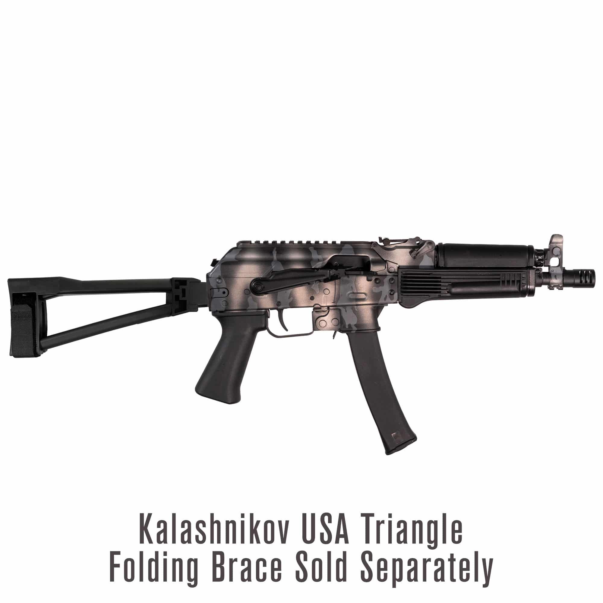 The KP 9 Pistol from Kalashnikov USA satisfies all your urges in the shooting range or any other setting. The Urban Strike Camo gives you this “urban” look to blend with your outfit, both for protection and style. Those who prefer the pistol style can use the JMac RSA 5.5 stock adapter along with the 1913 pistol brace by SB Tactical. The KP-9 accepts Kalashnikov USA 30 round magazines, has a hinged top cover and Picatinny rail along with ½”-28 threaded flash suppressor. This Special Edition features our NEW Urban Strike Camo. Kalashnikov USA Triangle folding brace sold separately.