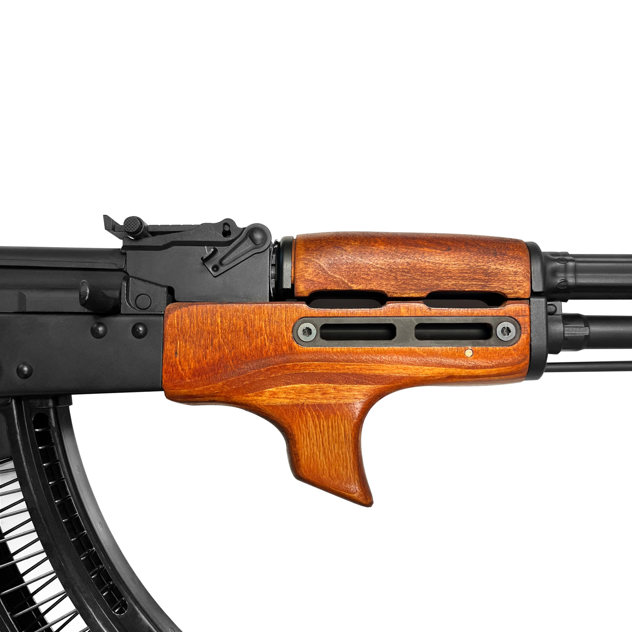 Kalashnikov USA is proud to introduce another offering from our custom shop. We started with a tried and true fixed stock KR-103 IN 7.62X39MM and added our custom wood furniture in “rust orange” featuring the the sought after SHARK FIN MLOK wood lower handguard with a matching upper handguard and ergonomic custom grip. This shark fin lower was custom fitted with double MLOK rails on both sides of the handguard so the latest MLOK accessories can be utilized. This build gives you the iconic wood look with the latest mounting options. These furniture sets are made of Baltic Birch laminate coated in shellac.
