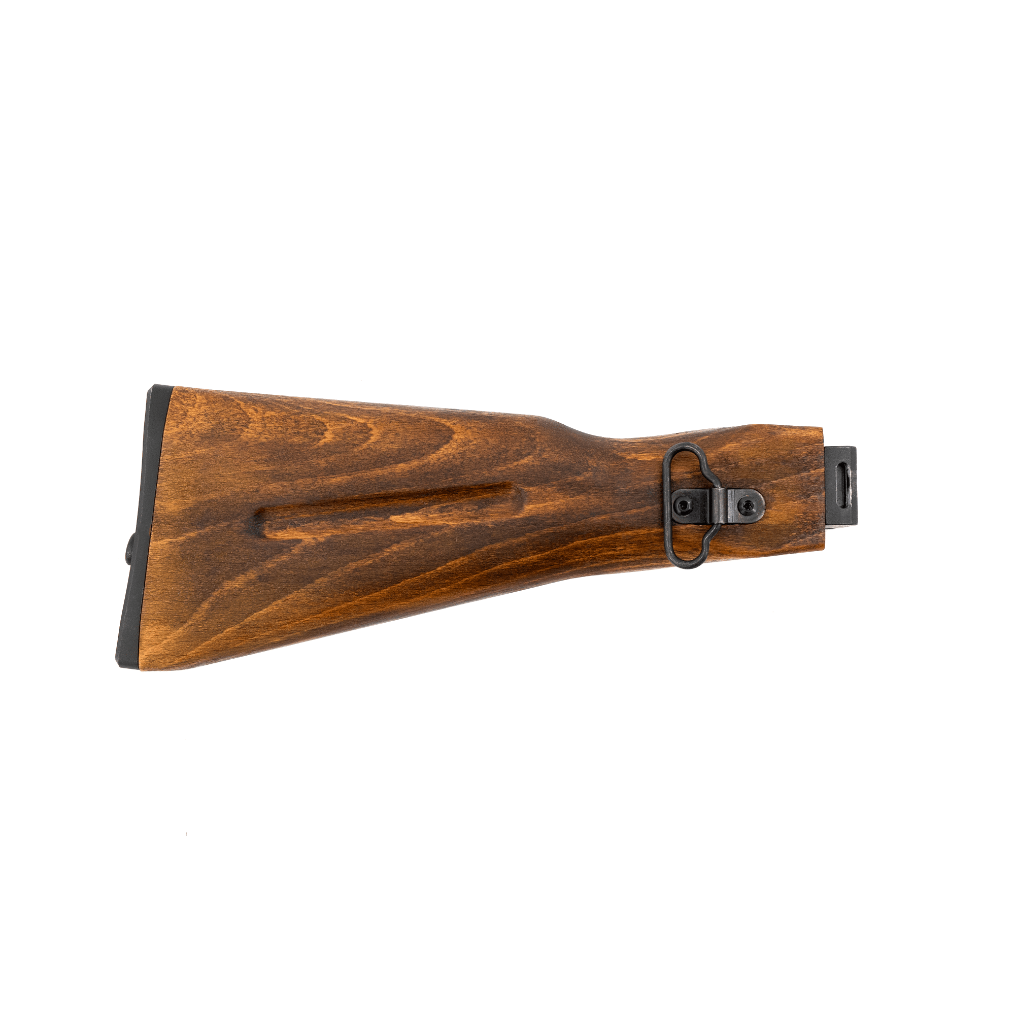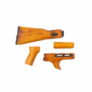 Kalashnikov USA is proud to introduce the “Premium K-Series” 5.5 folding stock set in Rustic Brown. This set includes the much sought after and elusive 5.5mm folding stock to give your rifle that authentic AK look. Theses 5.5 folding stocks are made of European beechwood and the steel swivel hinge is through bolted through the entire length of the stock for rigidity and hard use. Included in this set is grip, upper handguard and a custom “sharkfin” lower handguard with integrated two steel M-LOK inserts per side so all of the available M-LOK accessories such as lights can be mounted while retaining that authentic AK look and feel known the world over.