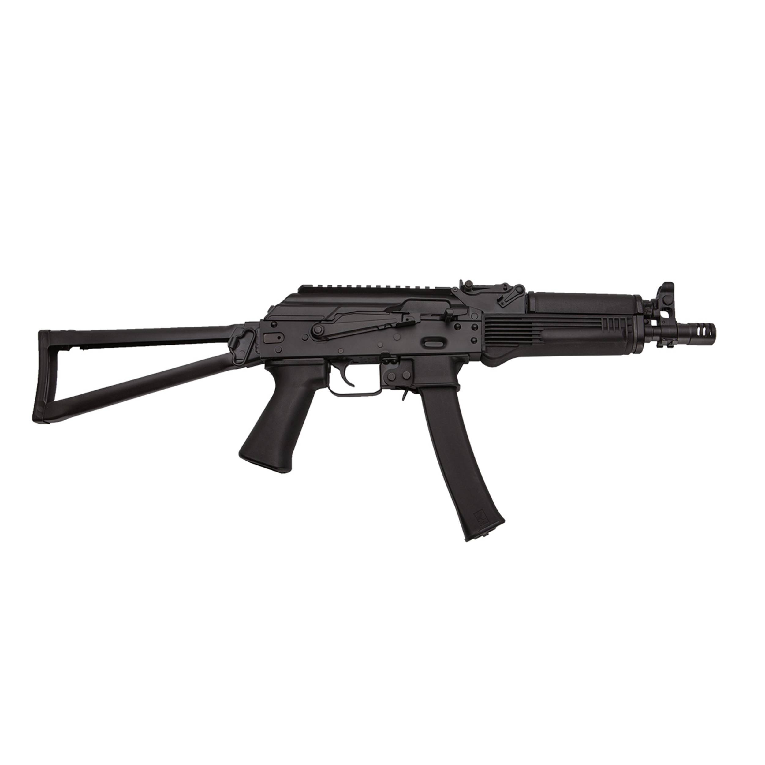 The KR-9 SBR is a semi-automatic short-barreled rifle based on the Russian PP-19-01 Vityaz submachine gun. This AK-style SBR has a small 9.25” barrel and works on closed bolt blowback operation. It is chambered in 9mm and feeds on 30 round and 10 round Kalashnikov USA™ magazines. It comes with a skeletonized Vityaz style triangle folding stock and is compatible with standard AK parts and accessories.