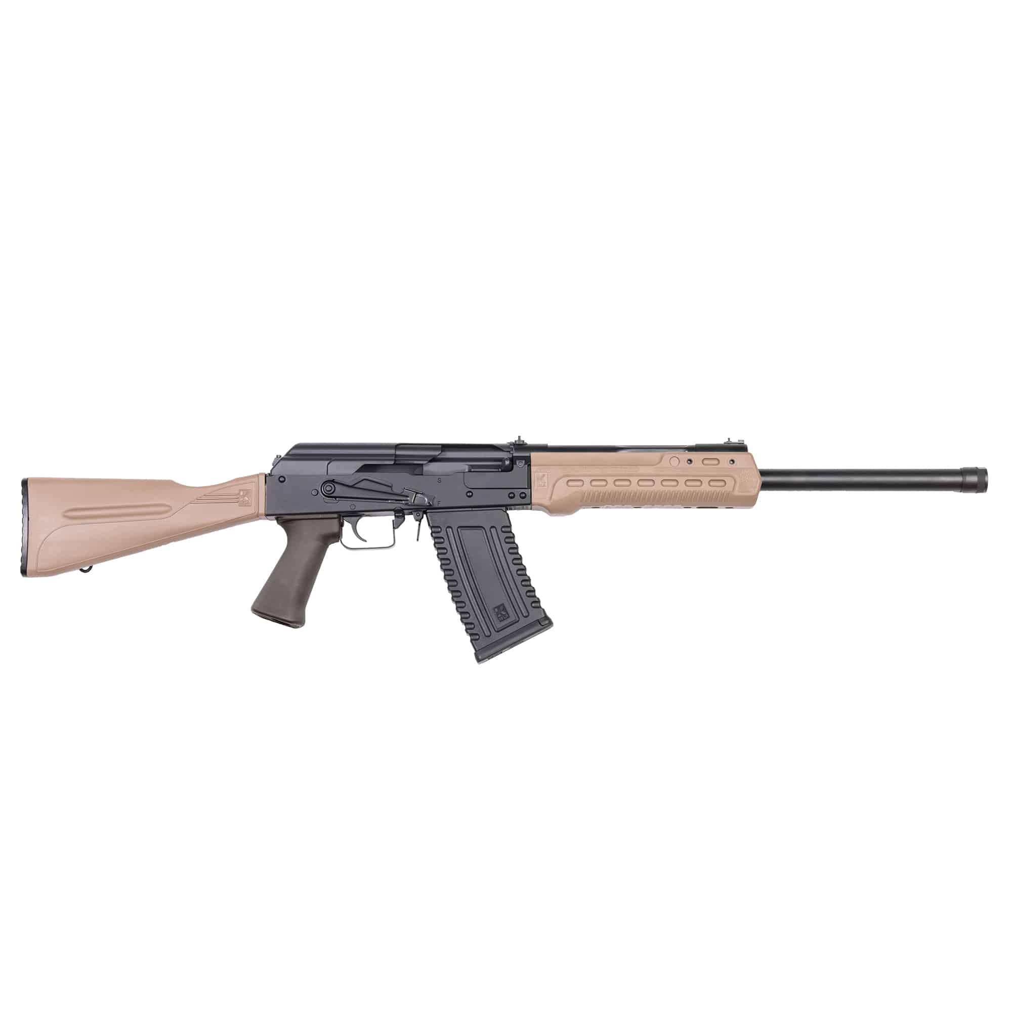 The Kalashnikov USA™ KS-12 shotgun FDE is a semi-automatic shotgun made here in the U.S.A. and based on the Russian Saiga series. The KS-12 accepts 2.75” and 3” shells from low brass to slugs thanks to our innovative adjustable gas system. The shotgun also comes equipped with the classic AK style side-mounted optics rail. The threaded barrel on our KS-12 means you can install any muzzle break of your choice that fits. The KS-12 ships with one 5-round magazine. Larger magazines and drums are also available. Most currently available Saiga accessories will also work on the KS-12 including magazines, drums, muzzle devices and chokes.