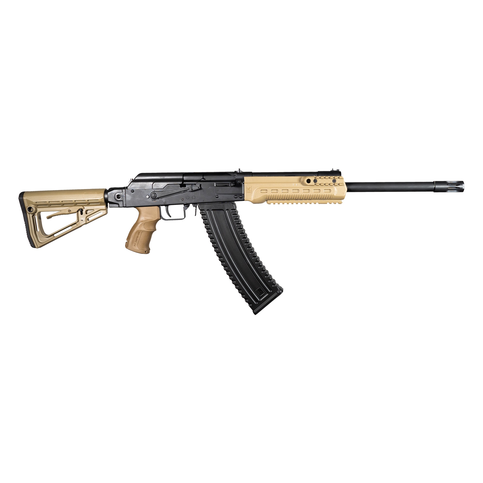 The Kalashnikov USA™ KS-12T Tactical FDE Shotgun is our 12-gauge semi-automatic shotgun based on the Russian Saiga series made here in the United States and customized out of the box for a variety of missions. The KS-12T FDE accepts 2.75” and 3” shells from low brass to slugs thanks to our innovative adjustable gas system. This firearm is not California compliant.