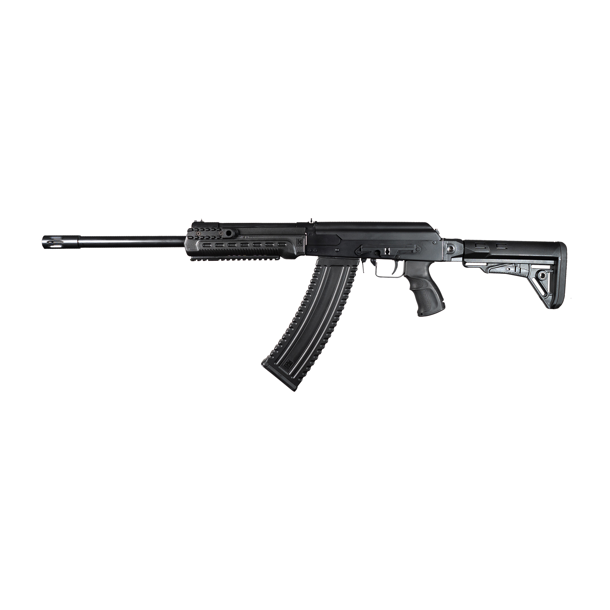 This gun is no toy. It is built on the rugged AK platform for the 12 gauge shotgun. It has a quick response time and works on a smooth gas piston operation with rotating bolt lock-up. It comes with an adjustable pistol grip, flash suppressor, tri-rail forend ready for any weapon light, and standard side-mounted optics rail. The total length of the Kalashnikov KS-12T FDE tactical shotgun comes to 42.25” with the buttstock fully extended and 38.5” when collapsed. The threaded barrel length is 18.25” and allows you to install any muzzle break of your choice that fits.