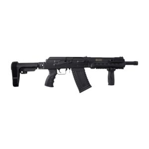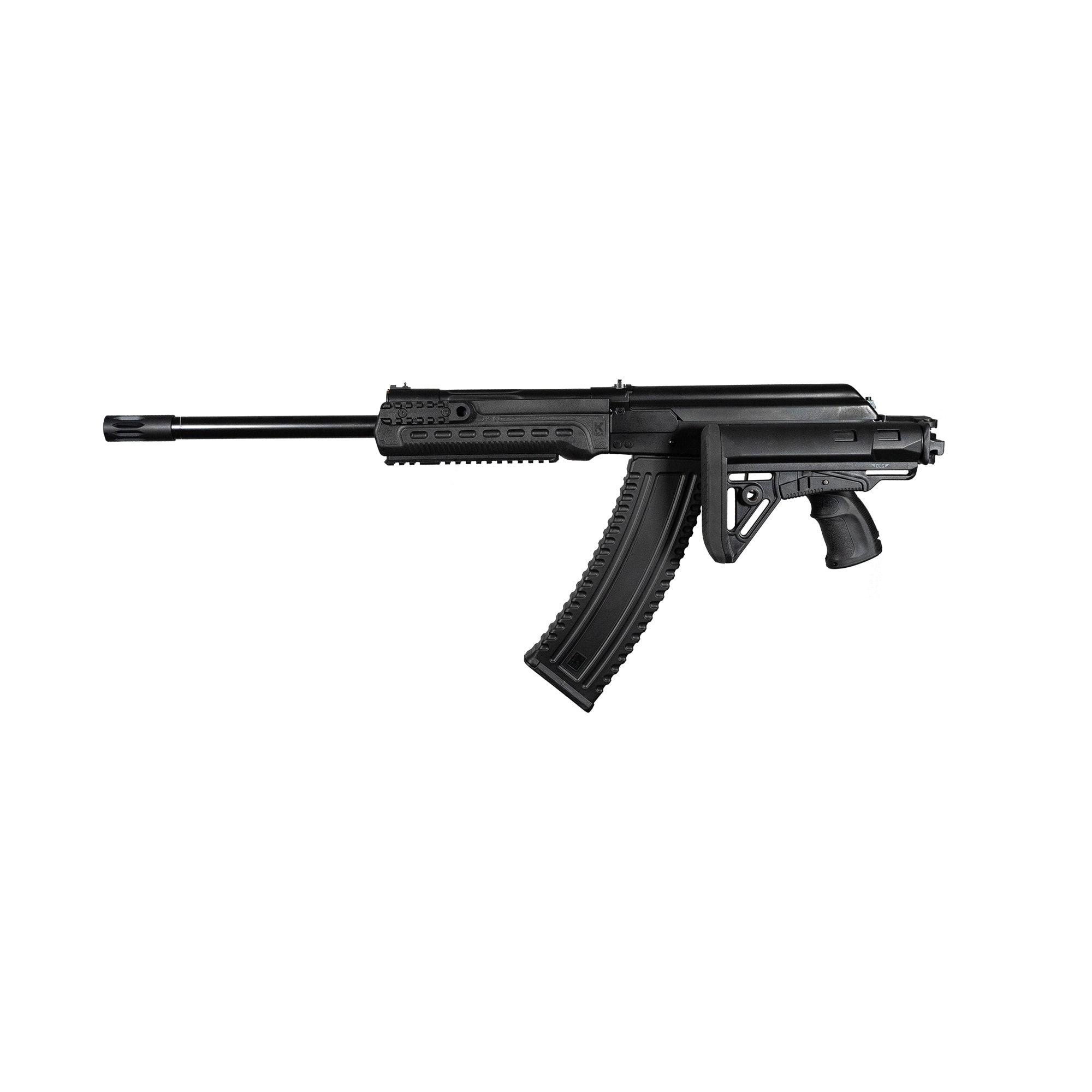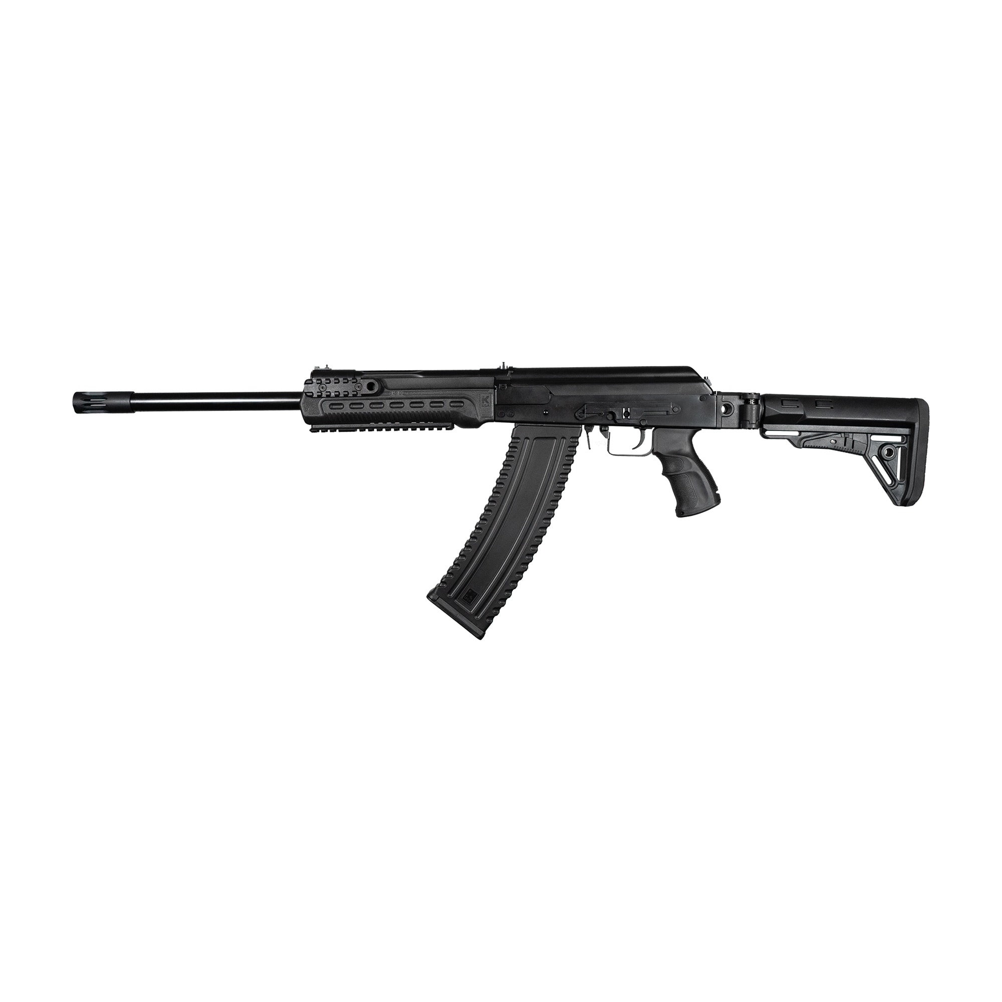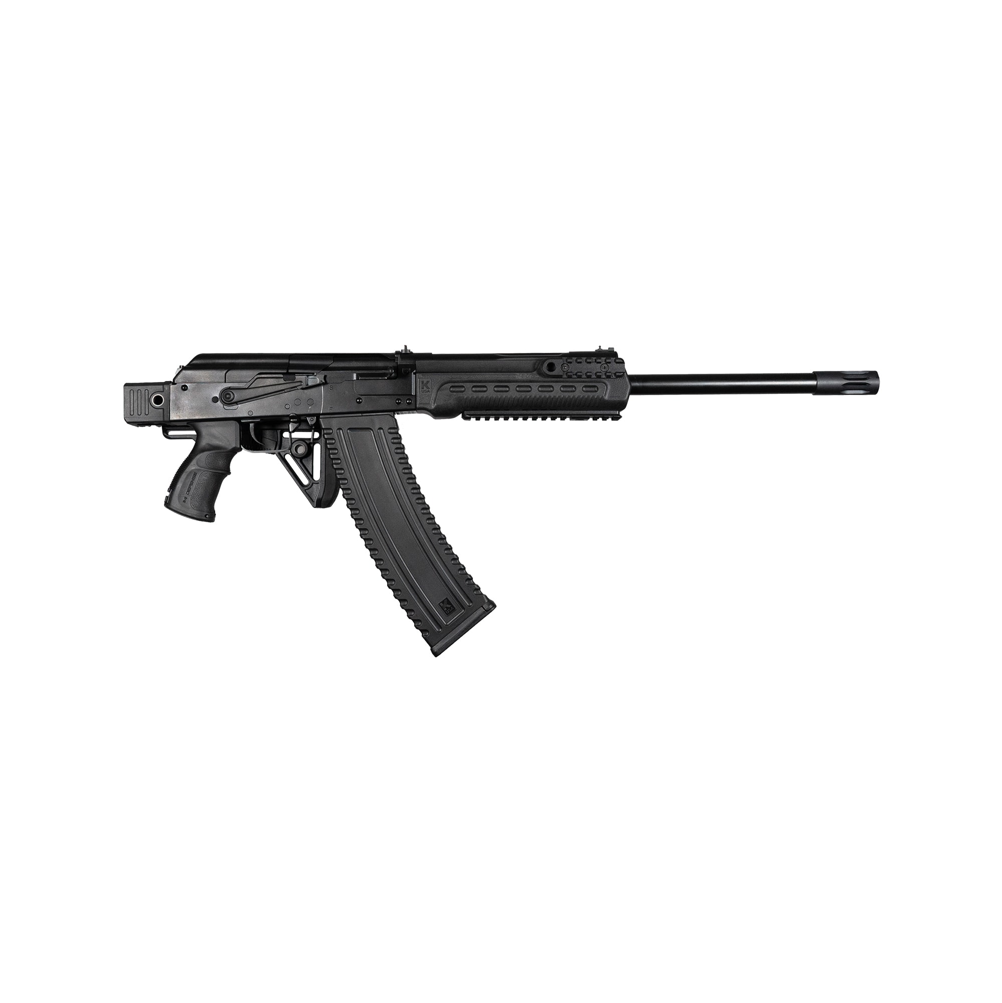 KS-12T SFS is Kalashnikov USA™’s side folding stock version of the KS-12T 12GA Tactical Shotgun. Based on the Russian Saiga series, the KS-12T SFS is a 12 gauge semi-automatic tactical shotgun with an 18.25” barrel. It is 100% made in the US with the ergonomics of an AK rifle. This gas-operated shotgun accepts 2.75” and 3” magnum shells and feeds with different rounds of box and drum magazines. It has a threaded barrel that allows you to install any muzzle break of your choice that fits. Its total length with the buttstock fully extended is 42.25” and 38.5” when collapsed.