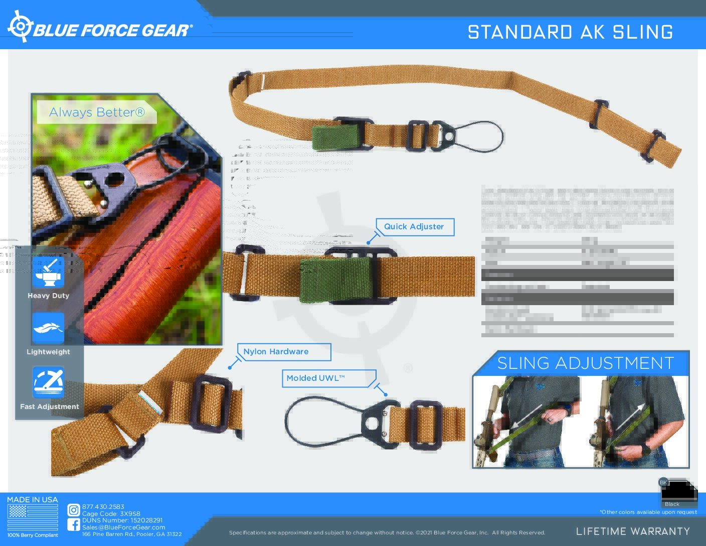 Kalashnikov USA is proud to introduce our AK Vickers sling in partnership with Blue Force Gear. This sling has a “KUSA” pull tab for fast adjustment. This is the go to sling for AK users.